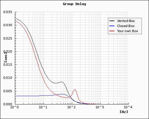 - Red: any construction of your enclosure using the same Thiele/Small-parameter. You are also able to calculate a Closed-Box if you make the value of the vent diameter very small (i.e 0.01).