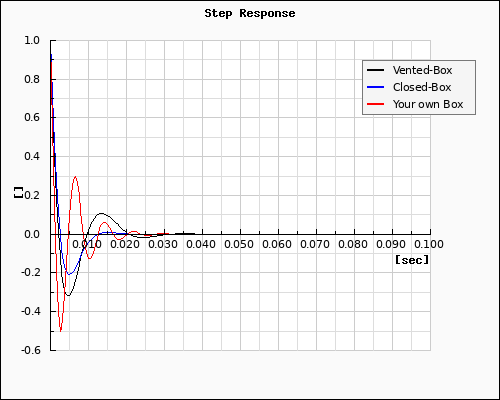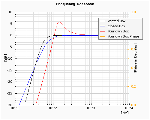 - Red: any construction of your enclosure using the same Thiele/Small-parameter. You are also able to calculate a Closed-Box if you make the value of the vent diameter very small (i.e 0.01).